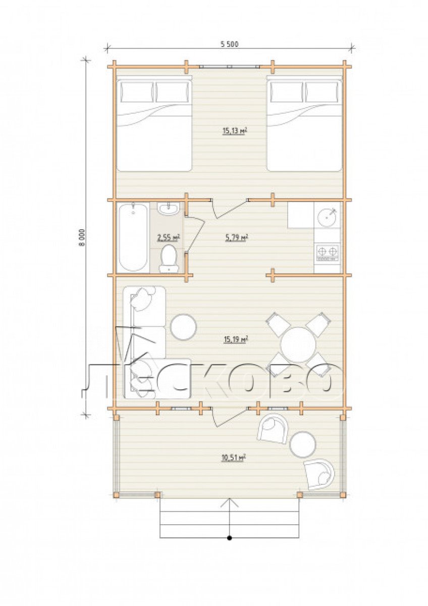 - Потолок: имитация бруса 20×135 мм., камерной сушки;